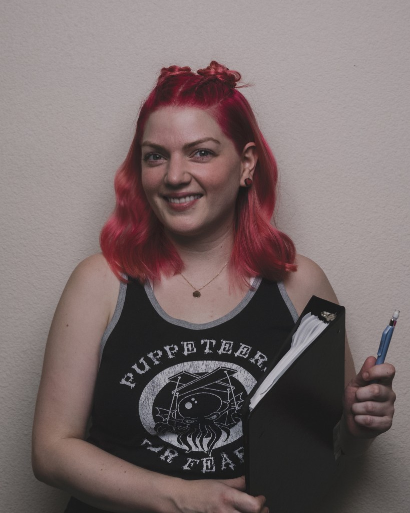 Originally from Arcata, California, Katy Curtis moved to Southern Oregon in 2012, attending SOU for her theater performance education. This is where her hand held its first puppet, and the rest is history…. After performing in two Puppeteers For Fears shows and directing two more, “Cthulhu: The Musical!” will be her fifth production with the company . When she isn’t working with these talented weirdos, she enjoys writing music and learning the piano while the cutest dog in the world is curled up nearby.